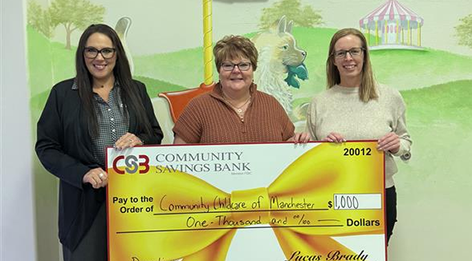 Community Savings Bank also recently donated $1,000 to Community Childcare of Manchester. Community Childcare of Manchester serves families with children in need of childcare all throughout Delaware County. They provide infant/toddler care, preschool care and classes, and school-age care including before and after school care and summer care. They currently have two separate locations in Manchester Carousel Child Care Center and Storyland ChildCare.